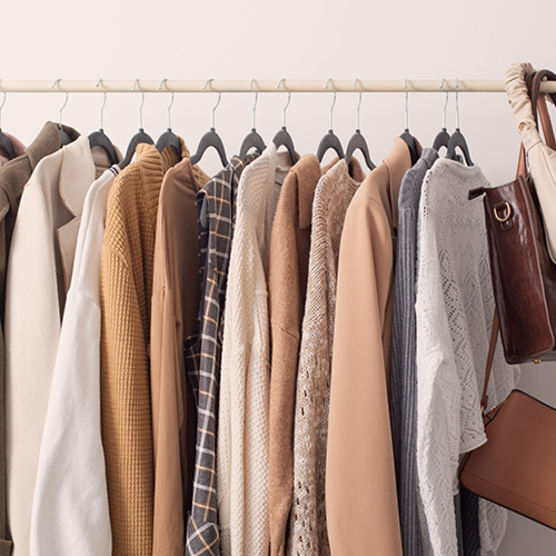 Gros plan sur une rangée de cintres en bois suspendus à une tringle métallique .